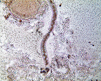 Haarwurm (Capillaria sp.) im Darm eines Diskus, der weibliche Wurm ist voll mit Eiern.